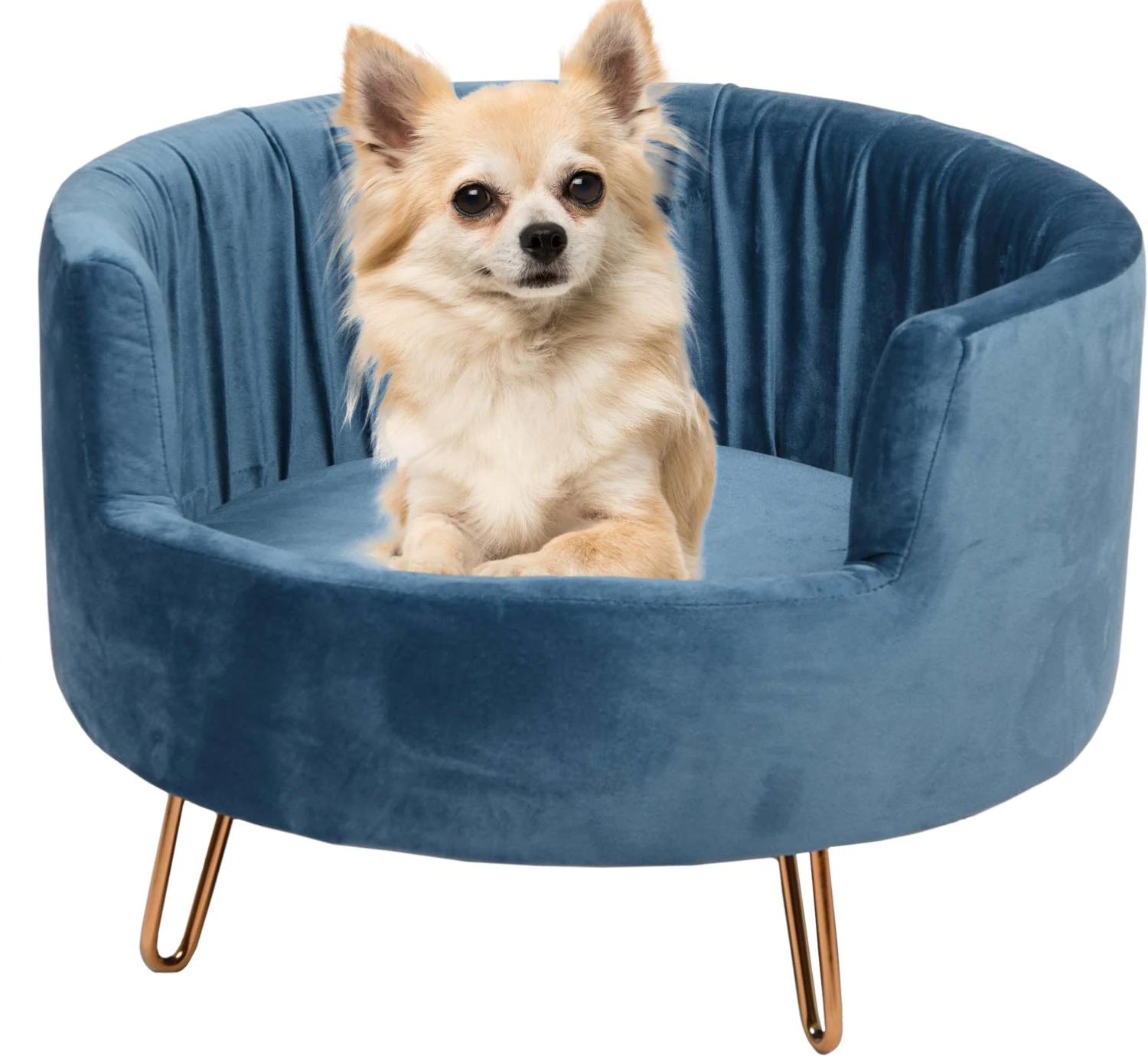 Un sofa pour chien doté de quatres pieds dorés qui lui donne un look très chic. Il est recouvert d’un tissu en velours bleu pétrole.